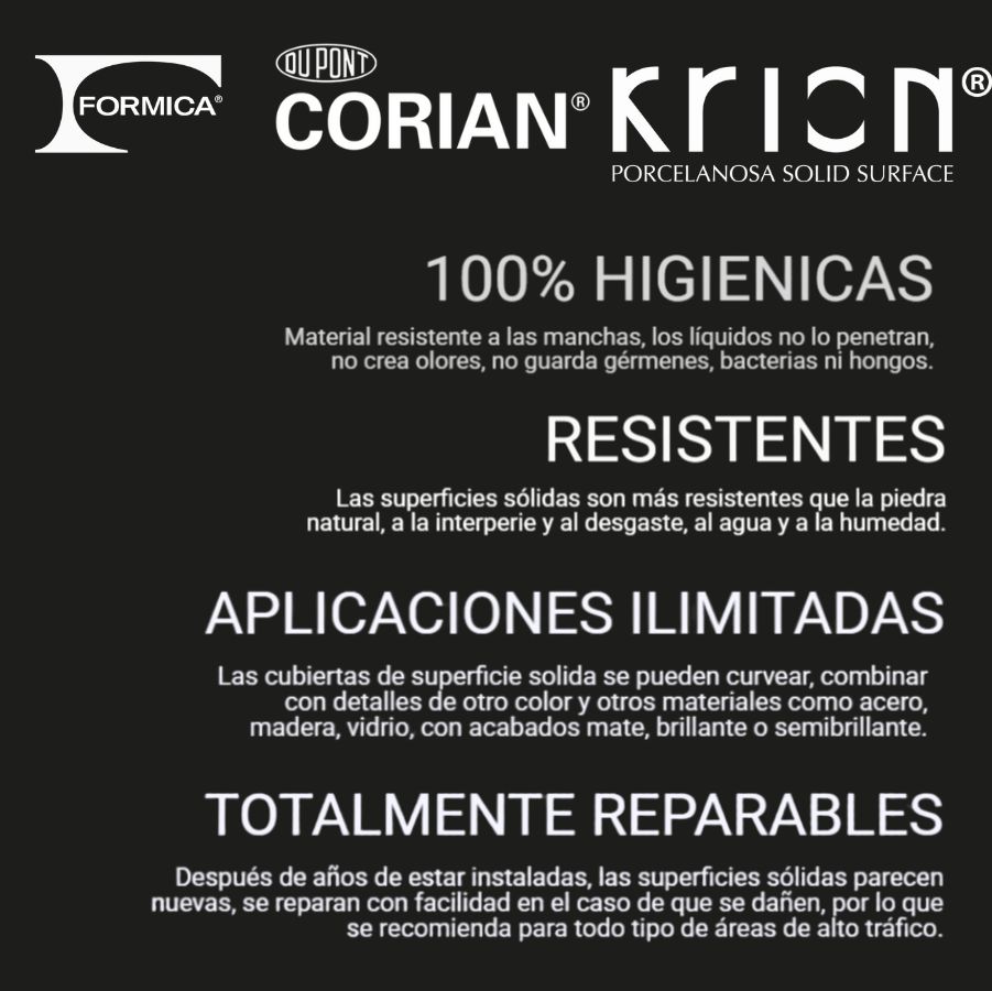 Material 100% acrílico, no guarda olores, gérmenes ni hongos. Más resistente que la piedra natural. se puede reparar y crear las más exóticas ideas que se tengan.